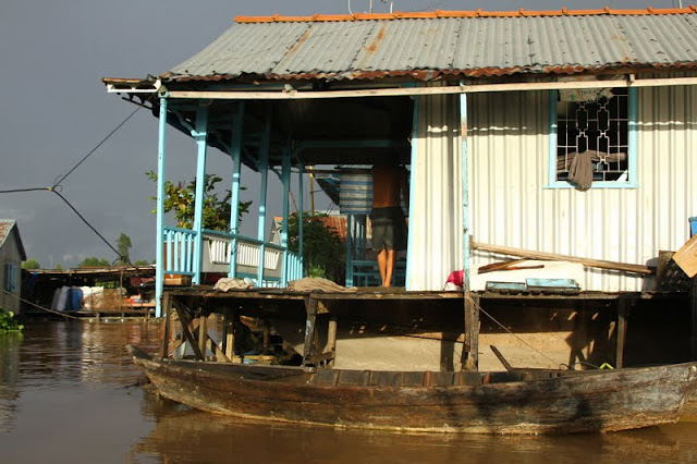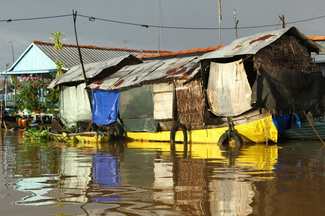 Depois de atravessar a fronteira e chegar a Chau Doc, uma cidade magnífica na margem do rio, fui abençoada pelas chuvas de monção. Atravessei a pé o mercado local ainda mais enlameado do que o normal e arranjei um hotel para dormir com vista sobre as casas flutuantes e o rio.