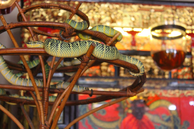 Estava à frente do meu horário, mas a partir daqui comecei a experiência do tráfego automóvel em Penang... Para regressar de autocarro a Georgetown precisei de quase duas horas e quase outras tantas para chegar ao templo das cobras.... Este templo desilude um pouco pois as cobras que decoram o altar estão completamente drogadas pelo cheiro do incenso! Mas é bom que não se mexam muito para as fotos...