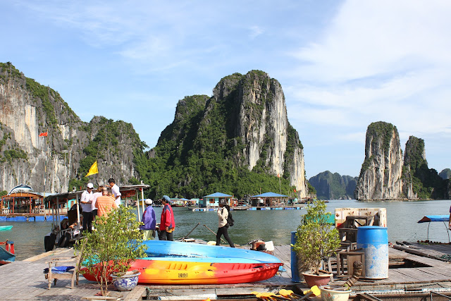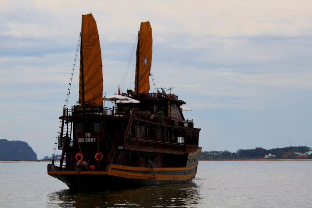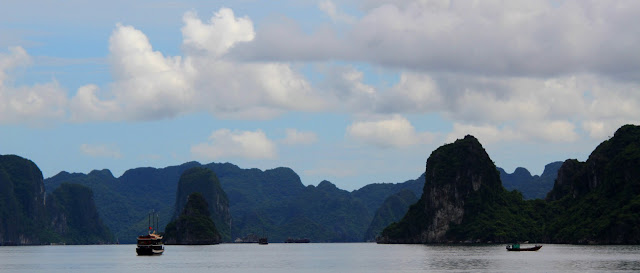 Cheguei a Halong, local onde deveria apanhar o barco para a baía, às 13.30h. Fui encaminhada para o barco e este começou a navegar, no entanto, também esta navegação foi por pouco tempo. O barco ao fim de 10 minutos parou e os empregados chamaram toda a gente para dentro, iam começar a servir o almoço. Fiquei "fula"! Almoço? Quem é que pensa em comer quando tem a baía de Halong a 40 minutos de barco? Não queria acreditar. Mas, era mesmo verdade. Lá comi, com pouca vontade. O barco recuperou a marcha e passado algum tempo entramos na baía propriamente dita e estávamos rodeados de formações calcárias emersas.