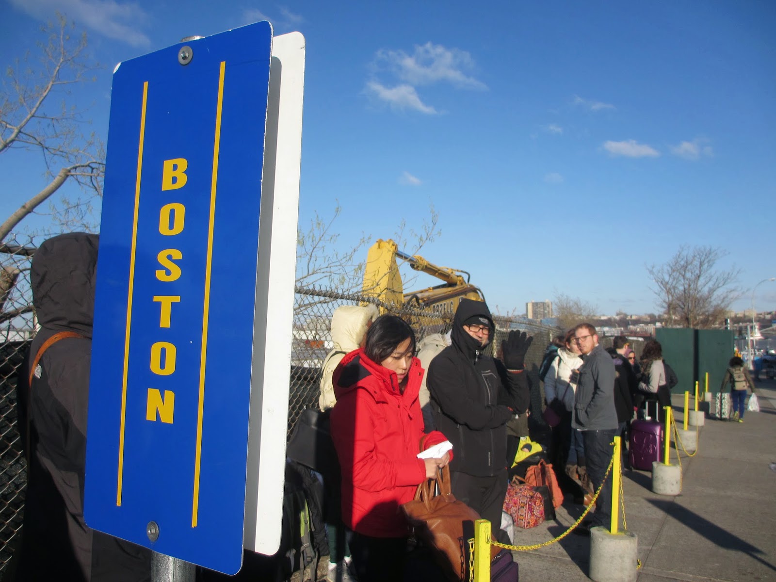 Há várias empresas de autocarro que fazem a ligação de Boston a Nova Iorque. Nós usamos a Megabus, uma companhia de bus Low Cost. Marcamos a viagem com algumas semanas de antecedência e conseguimos bilhetes a 3$/pessoa. O bus sai às 8 am de Nova Iorque. No entanto, não sai de um terminal de bus, sai de uma paragem na estrada - 34th street (entre a 11th e a 12th avenue) - onde existem umas tabuletas com o nome do destino e o símbolo da Megabus. Há muitas filas, porque é possível viajar com esta companhia para Washington, Niagara, Toronto, Filadélfia, etc. Basta procurar a tabuleta com o seu destino e aguardar a chegada do bus. Não convém chegar muito tempo antes quando está muito frio (erro que nós cometemos) porque a zona é completamente desabrigada e muito fria. Os autocarros são bons, confortáveis e seguros. A viagem demora cerca de 4 horas e o percurso é bonito. É uma excelente opção para viajar on a budget.
